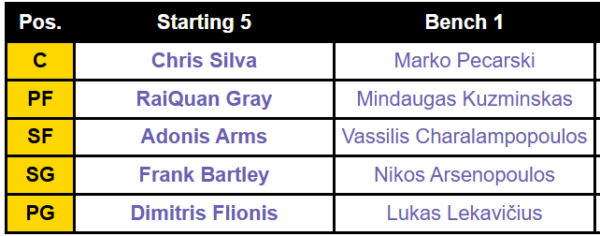 Vieglā uzbrucēja pozīcijā ir divi augumā lieli spēlētāji – amerikānis Adoniss Ārmss, kuram šī ir pirmā sezona Eiropas basketbolā. Pēc ļoti garas koledžu karjeras (seši gadi un četras skolas) Ārmss divas sezonas pavadīja NBA Attīstības līgā, bet pērnsezon īsi uzspēlēja Ķīnā (5 spēles). Otrs vieglais uzbrucējs ir krietni pieredzējušāks vietējais talants Vasilis Karalampopuloss. 28 gadus vecajam basketbolistam ir plaša ārzemju pieredze – četri klubi Itālijā, bet pērnā sezona pavadīta Ankaras “Turk Telekom” vienības mediķu aprūpē – basketbolists jau bija vienojies par līgumu, taču saplēsta krusteniskās saites. Tādējādi šī viņam ir atgriešanās sezona.