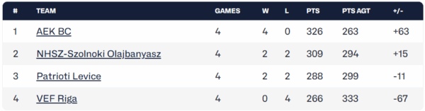 Pēc četrām spēlēm rīdzinieki ar “baranciņu” pie uzvaru skaita ir pēdējā vietā F grupā, kamēr trešajā vietā, kas vajadzīga, lai tiktu uz pārspēlēm, esošajai Levices “Patrioti” ir par diviem panākumiem vairāk, turklāt savstarpējā mačā rīdzinieki zaudēja ar -19…