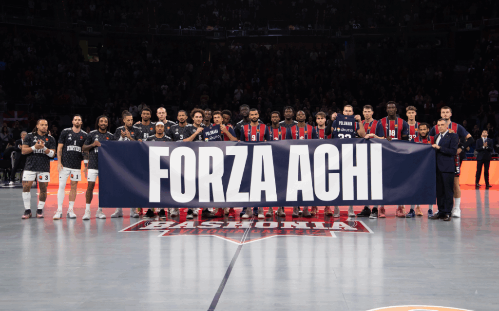 Rodions Kurucs un citi Vitorijas “Baskonia”, kā arī Boloņas “Virtus” spēlētāji pirms savstarpējās cīņas vienojās atbalsta paušanā itāliešu basketbolistam Akilem Polonaram, kurš šobrīd cīnās ar ļoti smagu slimību.