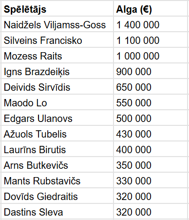 Viens no vasaras skaļākajiem papildinājumiem Āžuols Tubelis savā pirmajā sezonā ar “Žalgiri” pelna nedaudz virs 400 tūkstošiem eiro, taču Lietuvas čempioniem nācās arī samaksāt izpirkuma maksu “Rytas” klubam. Ieskaitot to, kopējā 2+1 līguma vērtība pārsniedz 1,7 miljonus eiro.