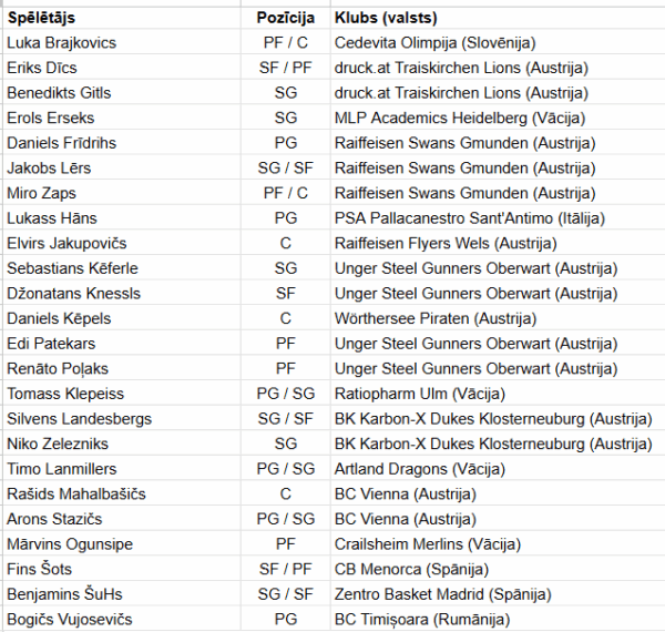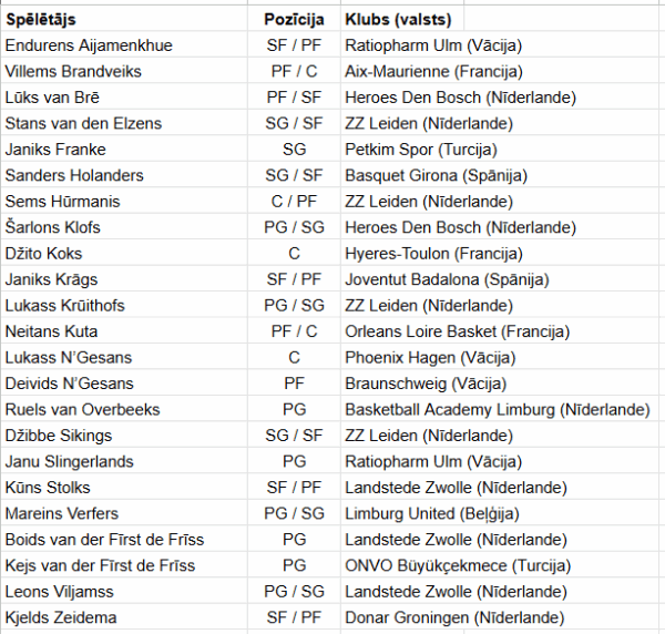 Sarakstā ir savu labāko karjeras sezonu sākušais Roberta Blumberga komandas biedrs turku vienībā “Petkim Spor” saspēles vadītājs Janniks Franke. Viens no Badalonas “Joventut” vadošajiem spēlētājiem Janniks Krāgs, kā arī turku kluba “Buyukčekmece” aizsargs Keje van der Vūrsts de Vrīss.
