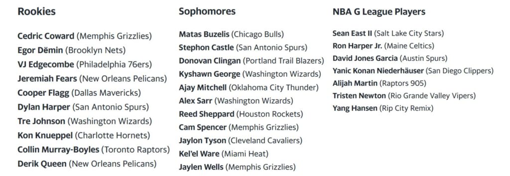 Kā jau paredzams, “Mavericks” uzbrucējs Kūpers Flegs, kuru vasarā draftēja ar 1. numuru, ir lielākā zvaigzne starp dalībniekiem šajā spēlē. Savās pirmajās 43 NBA karjeras spēlēs viņš vidēji guvis 18,8 punktus, izcīnījis 6,4 atlēkušās bumbas un atdevis 4,1 rezultatīvu piespēli.