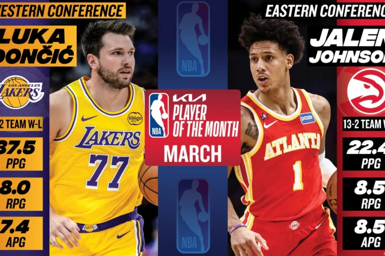 NBA 03.aprīlis, 17:39 Par marta labākajiem NBA atzīti Porziņģa bijušie komandas biedri NBA paziņojusi, ka marta mēneša sekmīgākie spēlētāji bijuši Luka Dončičs un Džeilens Džonsons. Losandželosas "Lakers" ma...